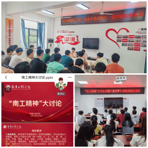 为深入挖掘和传承“南工精神”,近日,beat365英国官网通过“三会一课”、教职工政治理论学习、主题党日、主题团日、主题班会等多种形式,在教职工、学生党员、团员及校友中广泛开展“南工精神”大讨论。