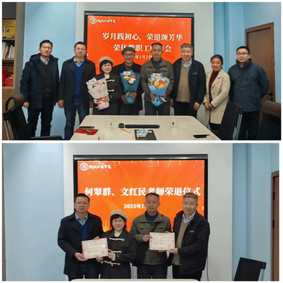 会议由唐刚院长主持,他代表学院向退休教职工们致以诚挚的感谢,赞扬了他们多年来的辛勤耕耘和无私奉献。随后,学院党委书记和院长为退休老师们献上献花,并为2024年退休的两名教职工颁发荣休证书。