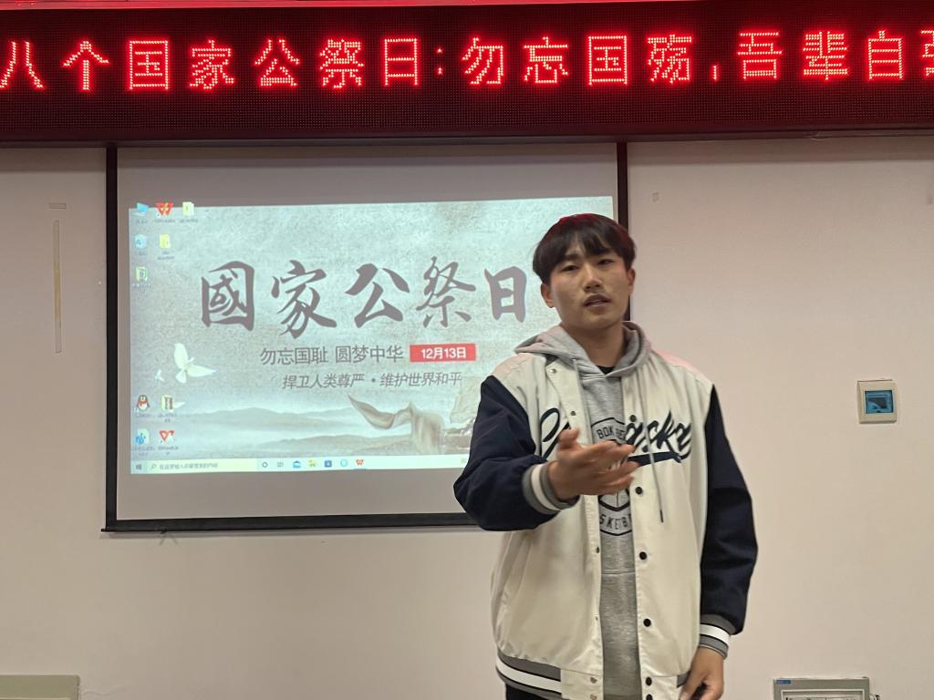 活动在庄严的国歌声中开始。全体成员为在南京大屠杀中牺牲的革命先烈默哀一分钟。在场成员聆听团委负责同志讲述国家公祭日的意义,并提出要勿忘国殇,吾辈自强。