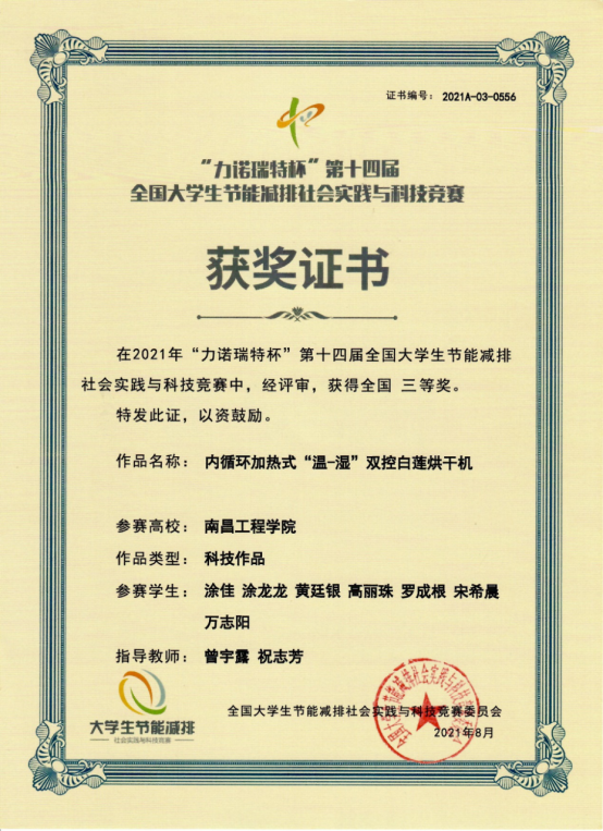 近日,由教育部高等学校能源动力专业教学指导委员会指导,全国大学生节能减排社会实践与科技竞赛委员会主办的“力诺瑞特杯”第十四届全国大学生节能减排社会实践与科技竞赛决赛在山东大学落下帷幕。由学院大学生机械创新基地19机制涂佳等同学完成的作品《内循环加热式“温-湿”双控白莲烘干机》经过校赛选拔推荐至国赛决赛,最终荣获全国三等奖的好成绩,也是本届大赛beat365唯一在决赛中获奖的作品。