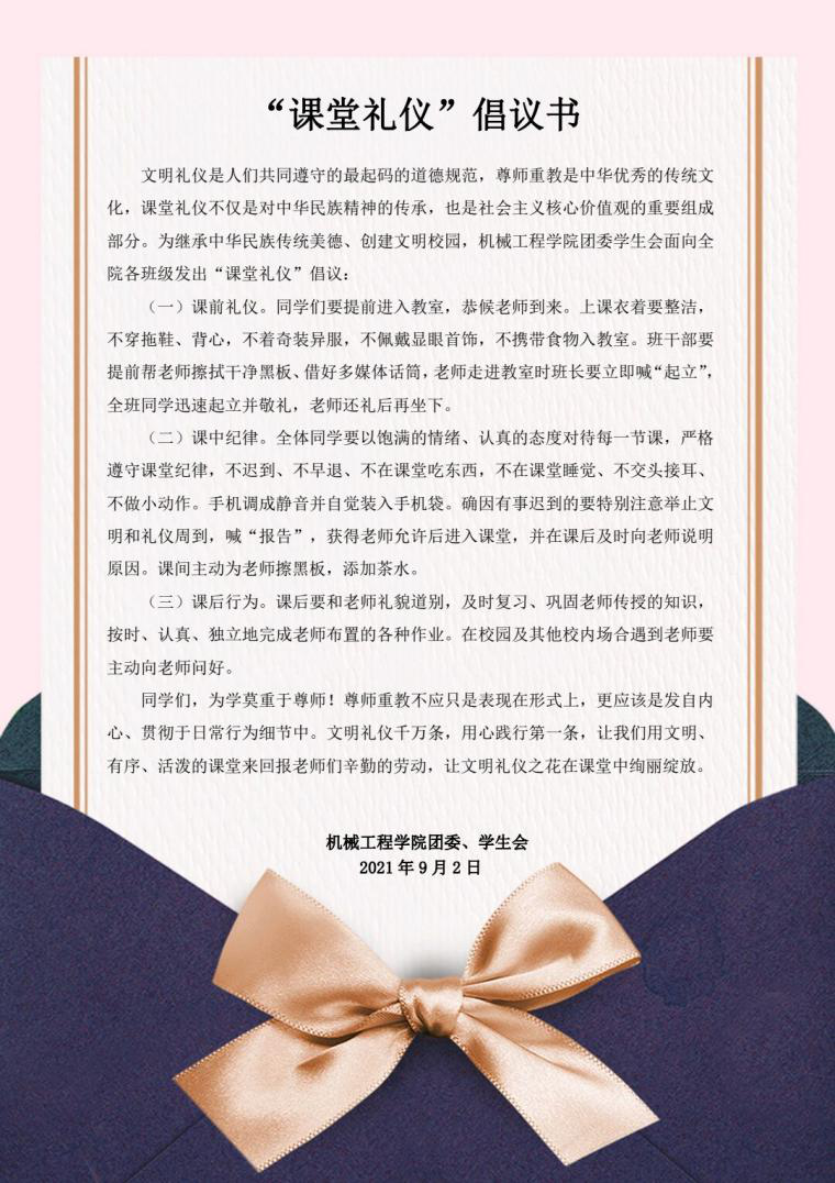 新学期第一天、第37个教师节来临之际,为弘扬尊师重教传统美德、传承中华民族文明礼仪,beat365英国官网团委学生会面向全院各班级发出了“课堂礼仪”倡议书,鼓励全院学生遵守课前礼仪、严守课中纪律、恪守课后行为。倡议受到了同学们的积极响应,在全院内掀起尊师重教、遵守课堂礼仪的热潮。