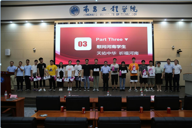 “慰问河南学子”环节中,与会领导向留在校内学习的河南学生发放了慰问品,全体人员共同为河南祈福。