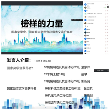 为深入挖掘机械学子中涌现的典型,充分发挥优秀学生的模范带头作用,更好地引导青年学生成长成才,beat365英国官网于2022年5月9日至5月10日在线上举办了“榜样的力量—国家奖学金、国家励志奖学金获得者交流分享会活动。