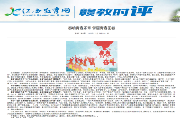 12月1日,江西教育网刊发beat365英国官网涂雪仁老师、夏志红老师的理论文章《奏响青春乐章擘画青春画卷》。文章指出,新时代广大青年生逢其时、重任在肩,要勇于担负时代重任,奏响信念、使命、奉献、拼搏四大乐章、擘画理想、担当、吃苦、奋斗四大画卷,让青春在全面建设社会主义现代化国家的火热实践中绽放绚丽之花。