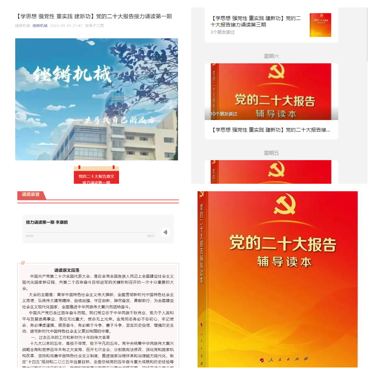 学院团委在官网微信“铿锵机械”公众号设立诵读专栏,打造每日云端课堂新体验,预计推送10期,截止目前已连续推送4期。学院学生团员在声情并茂、准确无误、流畅清晰的基础上用声音诵读报告,用声音感悟伟力,用声音传递力量,深入领悟党的二十大报告重要思想、战略和举措,在读原文、学原著、悟原理中强化责任感和使命感。(文/图 李康鹏)