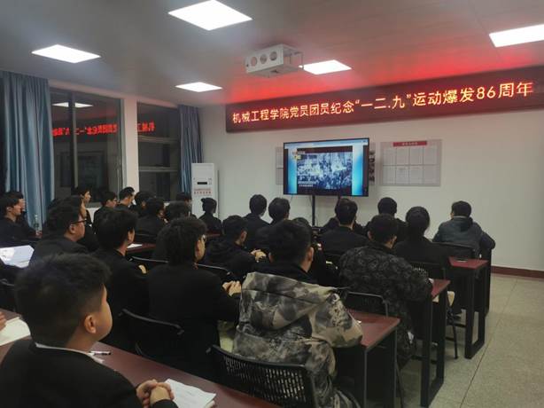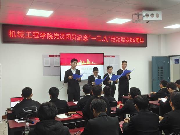 纪念活动中,党员团员们集体观看视频了《抗战史上的今天——一二.九》。新发展党员代表们朗诵诗歌《碧血丰碑》,朗诵慷慨激昂、震撼人心,仿佛带领大家又回到了1935年那个凛冽冬季。到场团员们宣讲“一二.九”精神,他们代表全体团员做出承诺,热爱祖国,不负青春,自强不息,矢志不渝。